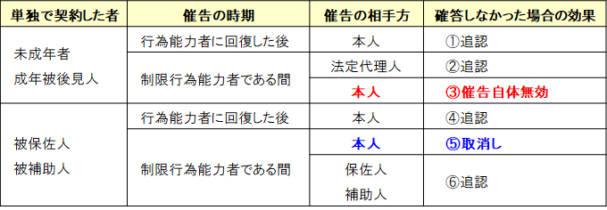 ①、②、④、⑥ 相手方が「保護者」「行為能力者に回復した者(元制限行為能力者)」に催告したにもかかわらず、確答がなかった場合、これらの者は行為能力があるにもかかわらず、確答しないことには落ち度があるので、相手方を保護して「追認」とみなされる。