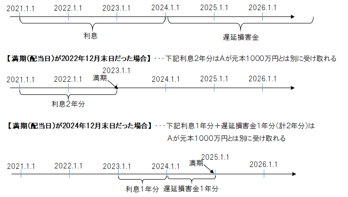 「満期となった最後の2年分」とは? 満期となった利息や損害金等の最後の2年分とは (覚える必要はありません。参考までに) 例えば、AB間の1000万円の貸金契約(2021年1月1日)について利息1%、遅延損害金10%と仮定し、弁済期を3年後の2023年12月末日とします。すると、弁済期までの3年間は「利息」が付され、弁済期以降の2024年1月1日以降は「利息」ではなく「遅延損害金」が付されます(利息と遅延損害金は同時には発生しない) ちなみに、「満期」とは「競売の配当日(お金が支払われる日)」を表します。