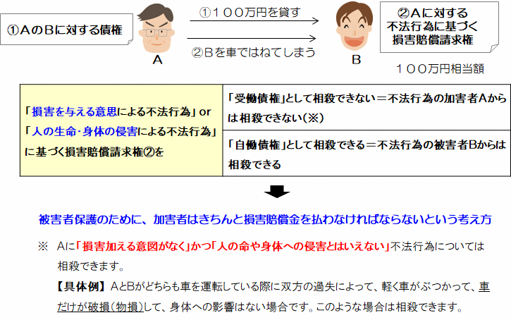 言い換えると、 「損害を与える意思による不法行為」「人の生命・身体の侵害による不法行為」の加害者からは相殺を主張することができないということです。