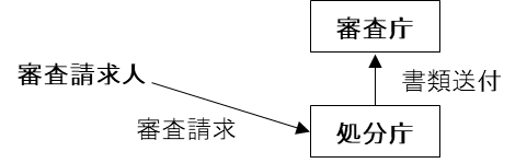 - 審査請求は、審査請求をすべき行政庁が処分庁と異なる場合には、処分庁を経由してすることもできるが、処分庁は提出された審査請求書を直ちに審査庁となるべき行政庁に送付しなければならない。