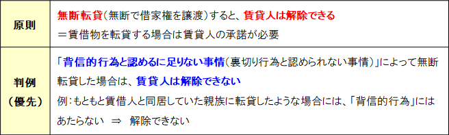 • 背信的行為と認めるに足りる事情(裏切り行為と認められる事情)によって無断転貸した場合・・・賃貸人は解除できる