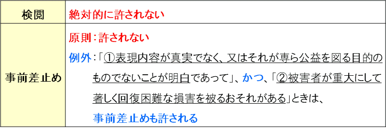 - 表現行為を事前に規制することは原則として許されないとされ、検閲は判例によれば絶対的に禁じられるが、裁判所による表現行為の事前差し止めは厳格な要件のもとで許容される場合がある。