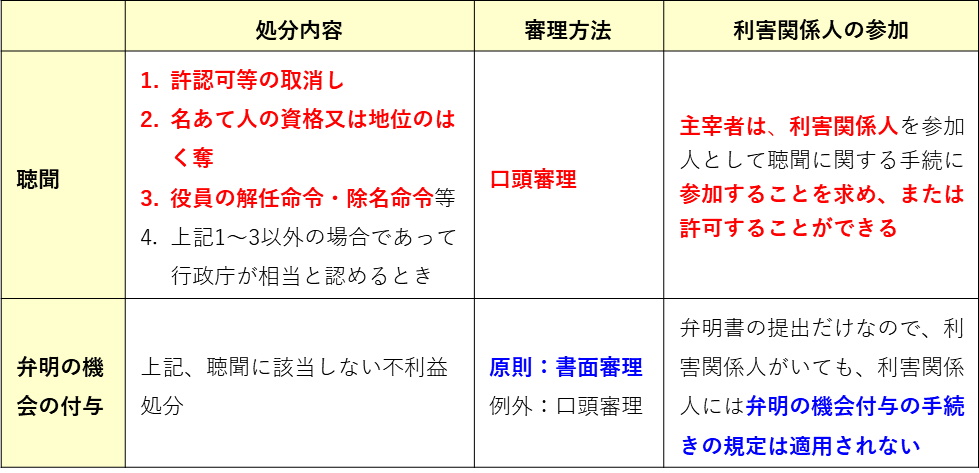 不利益処分を行う前に行う手続きは「意見陳述の機会(聴聞・弁明の機会付与」です。