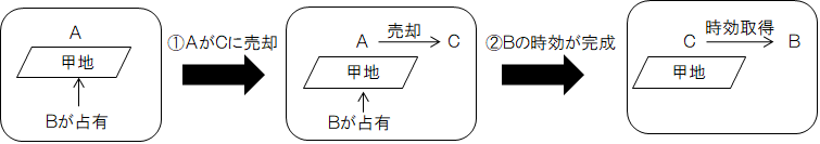 理由 始めに、A所有の甲地をBが占有し、その後、①AがCに甲地を売却し、(まだBが占有中)、その後、②Bの時効が完成したという流れです。時系列を図にすると下のようになります。(左から右に時間が流れている)