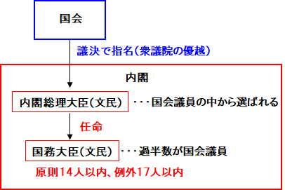 そして、内閣総理大臣が国務大臣を選び、国務大臣の過半数は国会議員でなければならないです。(68条)