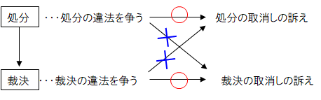 そして、処分の違法を訴える場合、また裁決の違法を訴える場合、「処分の取消しの訴え」と「裁決の取消の訴え」のどちらを行えることができるのか?