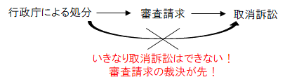 ただし、個別の法律に、「審査請求に対する裁決を経た後でなければ、処分の取消しの訴えを提起することができない」旨の定めがある場合、審査請求を先に行い、その裁決がなされた後でなければ訴えを提起することはできません。これを審査請求前置主義と言います。
