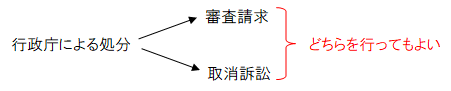 そして、違法な処分については、審査請求の申立てもできるし、審査請求をせずに処分の取消しの訴えの提起でもよいです。どちらを行ってもよいです。これを自由選択主義と言います。