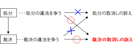 言い換えれば、処分の違法を主張するのに、裁決の取消訴訟は行えないということです。