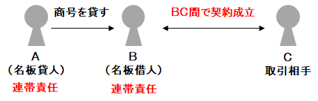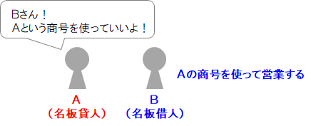 例えば、名板貸Aが、名板借人Bに、Aの商号使用を許諾をしたとします。