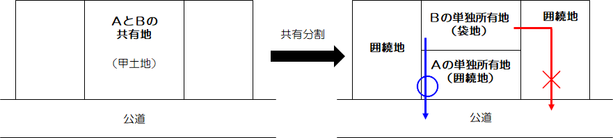 袋地が、共有分割によって生じたときは、袋地の所有者は、公道に至るため、他の分割者の所有地のみを通行することができます。