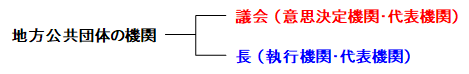 まず、普通地方公共団体を運営していく上で議会と長の2つの機関があります。