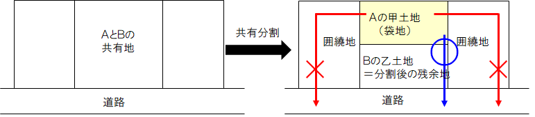 【具体例】 もともと、上の左の図のように「AとBの共有地」は、道路に接しているので、袋地ではありません。その後、下の右の図のように共有分割をすると、Aの甲土地が袋地になります。土地の分割によって新たに袋地が生じた場合は、当該袋地の所有者は、公道に出るため、もう一方の土地(分割後の残余地)についてのみ無償で通行でき、必要であれば通路を開設することができます。