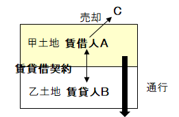 - AがBとの間の賃貸借契約に基づいて乙土地を通行している場合において、その後に甲土地がCに売却されたときは、これによりCも当然に乙土地を通行することができる。