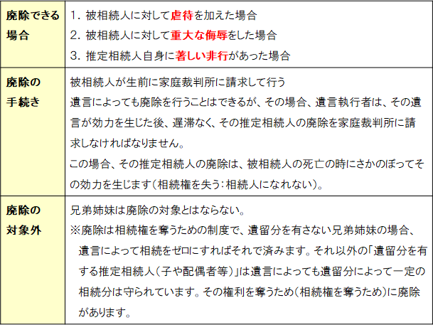 遺留分を有する推定相続人(相続が開始した場合に相続人となるべき者)が、被相続人に対して①虐待をし、若しくは②これに重大な侮辱を加えたとき、又は③推定相続人にその他の著しい非行があったときは、被相続人は、その推定相続人の廃除を家庭裁判所に請求することができます(民法892条)。