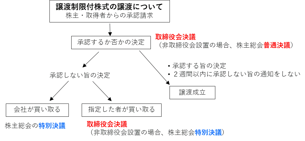 譲渡制限株式の株主は、その有する譲渡制限株式を他人(当該譲渡制限株式を発行した株式会社を除く。)に譲り渡そうとするときは、当該株式会社に対し、当該他人が当該譲渡制限株式を取得することについて承認をするか否かの決定をすることを請求することができます(会社法136条)。