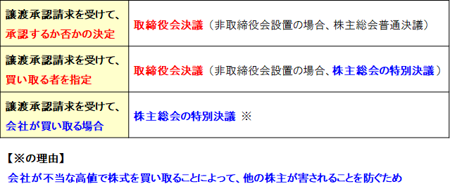 オ.譲渡制限の定めのある株式の譲渡による取得を承認しない旨の決定をした会社が当該株式を買い取る場合は、対象となる株式を買い取る旨、および会社が買い取る株式の数について、取締役会の決議により決定する。