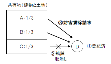 イ Cが甲土地および乙建物にかかる自己の持分をDに譲渡し、その旨の登記がなされたが、CD間の譲渡契約は錯誤により取り消された。この場合、AおよびBは、自己の持分が害されているわけではないので、単独でDに対してCD間の移転登記の抹消を求めることはできない。