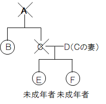 【具体例】 右図のように、Aが死亡し、BEFの三者が相続人であった。(Cが死亡し、EFが代襲相続する)EFは未成年者であり、EFの母Dが、EFの代わりに遺産分割協議に参加してBとDで遺産分割協議を行った。