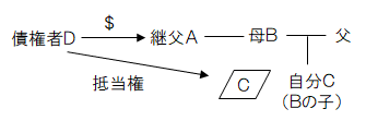 【具体例】 右図のように、Dが継父Aにお金を貸し、「Cの親権者(母)B」が、継父Aの債務を担保するためCの土地に抵当権が設定した。