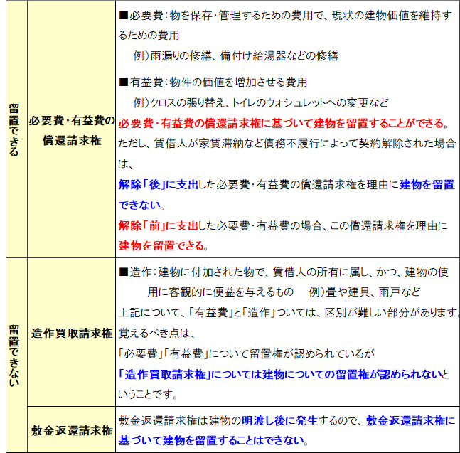 ●必要費・有益費の償還請求権に基づいて留置できる → 賃貸人への明渡しを拒むことができる