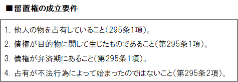 他人物の占有者は、その物に関して生じた債権を有するときは、その債権の弁済を受けるまで、その物を留置することができます(民法295条)。