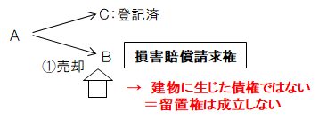損害賠償請求とは違います。そのため、当該損害賠償請求権では、留置権は成立せず(Bは留置権を行使できない) 、BはCからの明渡請求を拒むことができません。