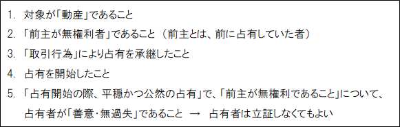 取引行為によって、平穏に、かつ、公然と動産の占有を始めた者は、善意であり、かつ、過失がないときは、即時にその動産について行使する権利を取得します(「即時取得」という)(民法192条)。つまり、即時取得の成立要件をまとめると下表のとおりで、この要件をすべて満たすと、動産を占有した者は、その動産の所有権を取得します。「要件1」について、対象は時計なので動産です。「要件2」について、債務者(前主)は、時計の所有者ではなく他人から借りているだけです。つまり、代物弁済するについて無権利者です。「要件3」について、判例では、代物弁済も取引行為に当たるとしています。「要件4」について、債権者は、占有を開始しています。「要件5」について、債権者は、平穏・公然・善意・無過失です。よって、すべての要件を満たしているので、債権者は、即時に時計の所有権を取得します。