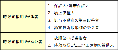 ■時効を援用できる当事者とは、具体的には、「取得時効により権利を取得する者」「消滅時効により義務を免れる者」を指し、さらに、消滅時効では「債務者以外に以下の4者」も含みます。