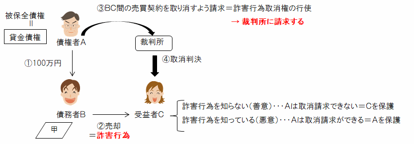そこで、民法では、債務者BがAを害することを知ってした行為(Cへの売却)について、債権者Aは、取り消すことができるとしています。これが「詐害行為取消権」です。具体的には、③債権者Aが裁判所に、詐害行為取消請求の訴えをし、④訴えが認められれば、取消判決となり、BC間の売買契約は取り消されます。