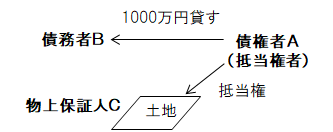 債権者Aが債務者Bに対して1000万円を貸したとします。Bは保証のための不動産を持っていないので、Bの親であるCが所有する土地を担保としました(土地に抵当権を設定)。この場合、Cが物上保証人です。万一、Bが期限までに1000万円を返さない場合、Aは抵当権を実行して(競売にかけて)Cの土地の競売代金からお金を回収することができます。