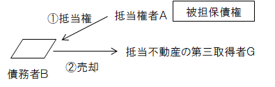 AがBに対して、お金を貸し、①B所有の土地に、抵当権者をAとして抵当権を設定した、その後、②抵当権が付着した土地を、GがBから購入した。