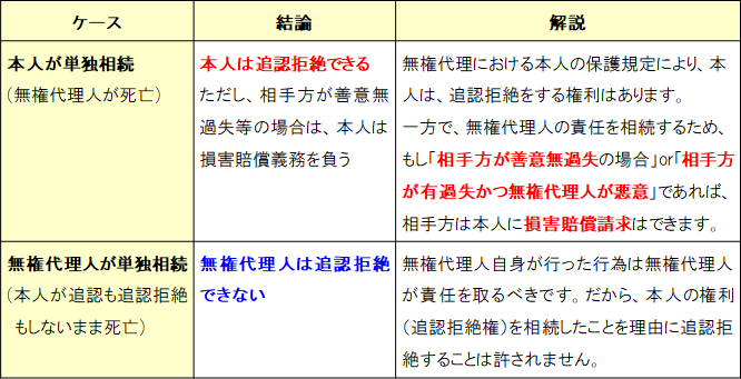 - Bが死亡してAが相続した場合、Aは本人の資格において本件売買契約の追認を拒絶することができるが、無権代理人の責任を免れることはできない。