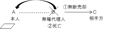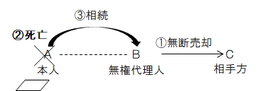 ①無権代理人Bが、本人Aに無断でA所有の甲土地をCに売却します。②その後、本人Aが死亡し、③無権代理人Bが単独相続します。