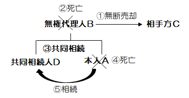 - Bが死亡してAの妻DがAと共に共同相続した後、Aも死亡してDが相続するに至った場合、Dは本人の資格で無権代理行為の追認を拒絶する余地はない。