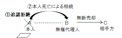 - Bが死亡してAが相続した場合、Aは本人の資格において本件売買契約の追認を拒絶することができるが、無権代理人の責任を免れることはできない。