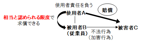 使用者Aが被害者Cに損害賠償金を支払った場合(=Aが使用者としての損害賠償責任を負担した場合)、使用者Aは被用者B(加害者)に対して求償することができますが、使用者が被用者に無制限に求償することはできず、判例では、「損害の公平な分担という見地から信義則上相当と認められる限度において」、使用者Aは被用者Bに対して求償することができるとしています。