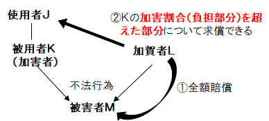 判例によると、「被用者Kがその使用者Jの事業の執行につき第三者Lとの共同の不法行為により他人Mに損害を加えた場合において、当該第三者Lが自己Lと被用者Kとの過失割合に従って定められるべき自己Lの負担部分を超えて被害者に損害を賠償したときは、当該第三者Lは、被用者Kの負担部分について使用者Jに対し求償することができるものと解するのが相当である」としています(最判昭和63年7月1日)。