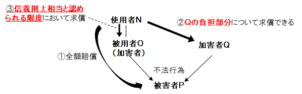 判例によると、「共同不法行為者たる被用者O及び使用者N、そして他の共同不法行為者Qは、被害者Pに対して、各自、被害者Pが蒙った全損害を賠賞する義務を負うものというべきであり、また、当該債務の弁済をした使用者Nは、他の共同不法行為者Qに対し、他の共同不法行為者Qと被用者Oとの過失の割合にしたがって定められるべき他の共同不法行為者Qの負担部分について求償権を行使することができるものと解する」としています(最判昭41.11.18)。
