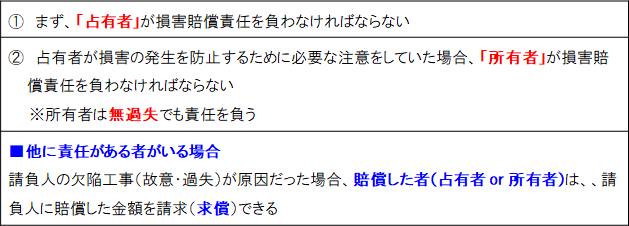 土地の工作物の設置又は保存に瑕疵があることによって他人に損害を生じたときは、その「工作物の占有者」は、被害者に対してその損害を賠償する責任を負います。ただし、占有者が損害の発生を防止するのに必要な注意をしたときは、所有者がその損害を賠償しなければなりません(民法717条1項)。そして、この1項の規定は、竹木の栽植(植えること)又は支持に瑕疵がある場合についても準用します(2項)。1項2項の場合において、損害の原因について他にその責任を負う者があるときは、占有者又は所有者は、その者に対して求償権を行使することができます(3項)。