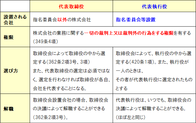 - 監査等委員会設置会社を代表する機関は代表取締役であるが、指名委員会等設置会社を代表する機関は代表執行役である。
