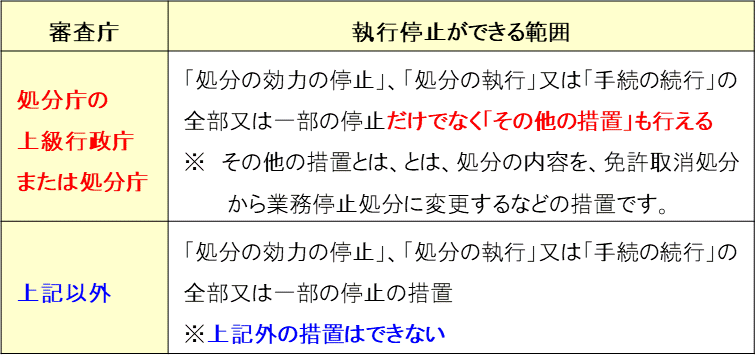 - 処分庁の上級行政庁または処分庁が審査庁である場合には、処分の執行の停止によって目的を達することができる場合であっても、処分の効力の停止をすることができる。