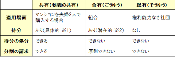 ※1 「共有」の持分については、持分を自由に処分(譲渡)することができ、目的物の分割請求もできることから「具体的」と記しています。