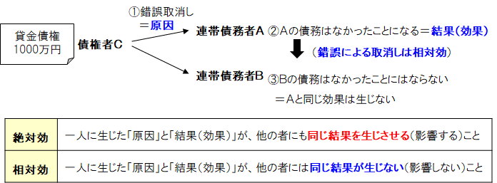①AがCに対して、錯誤により取消しを主張し、それが認められた場合、②Aの債務はなかったことになります。この場合、Bの債務はどうなるかというと、「錯誤による取消し」は、相対効なので、「錯誤による取消しの効果(=債務がなかったことになる)」は、他の連帯債務者Bにはが生じません。つまり、Bの債務はなかったことにはならず、Bが単独で1000万円の債務を負います。