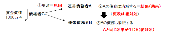 ●更改は絶対効 : 連帯債務者の一人との間で更改を行い、旧債務を消滅させると、他の債務者の債務も消滅する