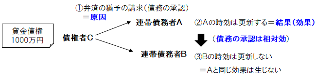 ●弁済の猶予の請求(=債務の承認)は相対効 : 連帯債務者の一人が債務の承認により、時効が更新しても、他の連帯債務者は、時効の更新の効果は生じない