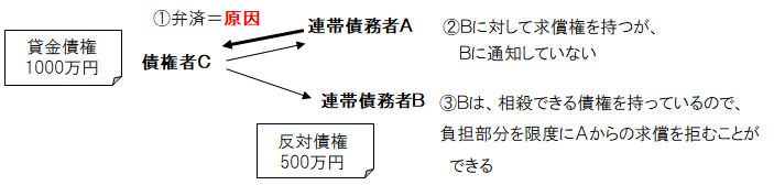 本問の「Cから履行を求められたAが、あらかじめ共同の免責を得ることをBに通知することなくCに弁済した」とは、AがCに弁済する前に、その旨をBに伝えていなかった場合です。Aは弁済することで、他の連帯債務者Bに対して求償権を持つが、もし、他の連帯債務者Bが反対債権を有していた場合、Bは負担部分(本問の場合500万円)を限度に、Aに対抗することができます。つまり、Bは500万円を限度にAからの求償を拒むことができます(民法443条)。