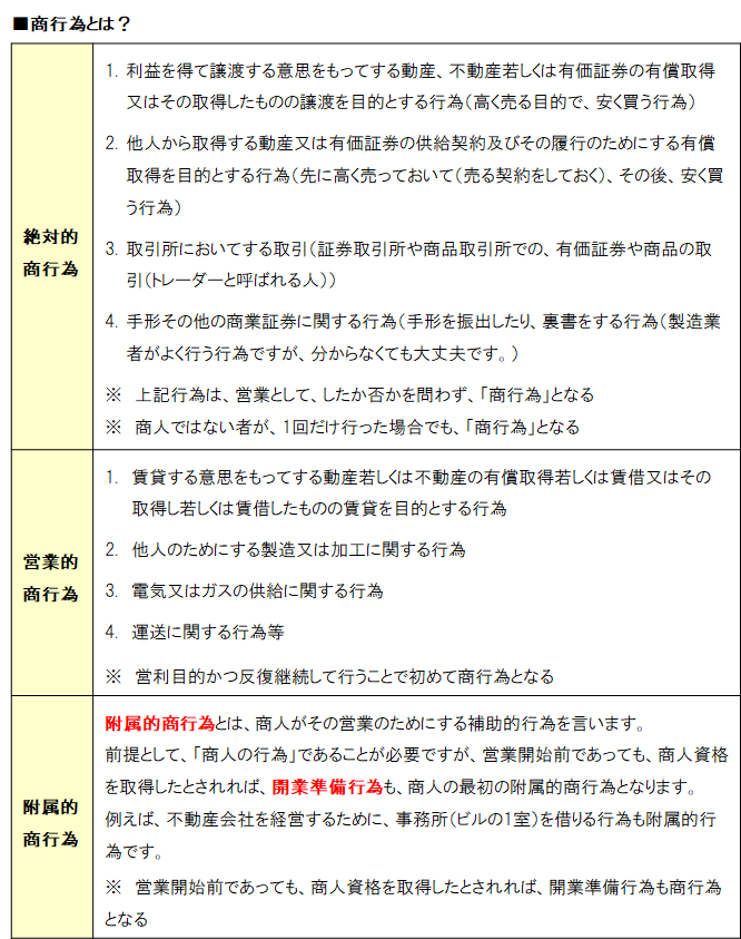 | 附属的商行為 | 前提として「商人の行為」である 営業開始前であっても、商人資格を取得したとされれば、開業準備行為も商行為となる |