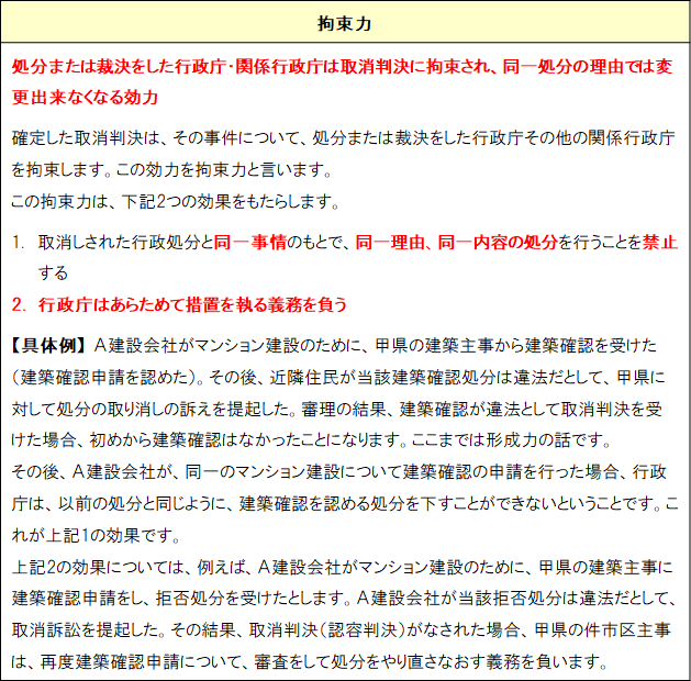 このように、処分又は裁決をした行政庁その他の関係行政庁を拘束する効力を「拘束力」と言います。