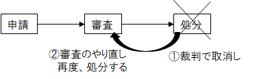 ●「申請に対する拒否処分」について取消判決 → 行政庁は、改めて申請に対して処分する義務を負う(拘束力)